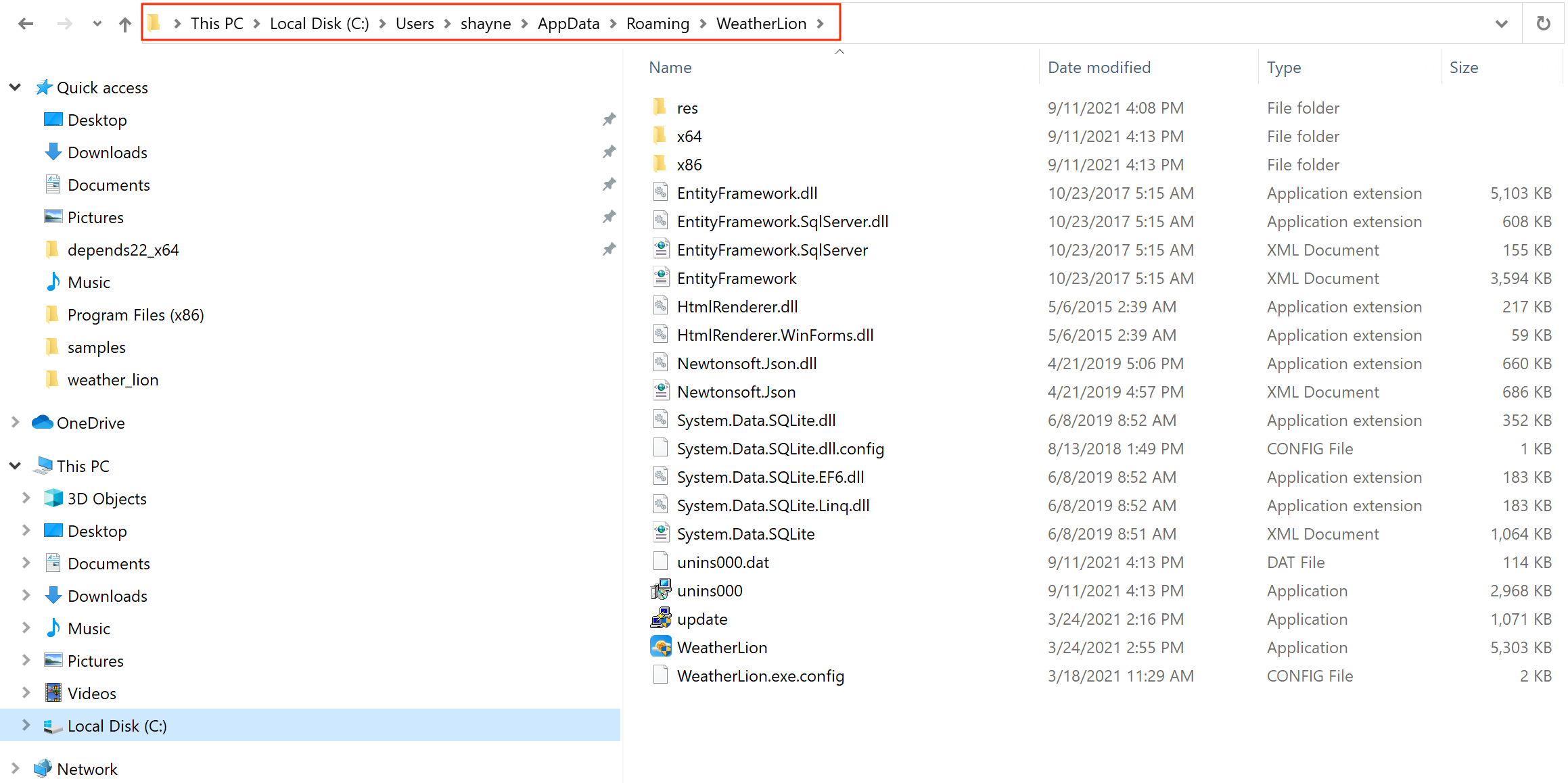 C:/Users/shayne/AppData/Roaming/WeatherLion/. The screenshot below shows its contents in the Windows File Explorer.