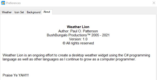 such as the wonderfully exuberant “About” section of WeatherLion’s preferences, shown below, suggest that